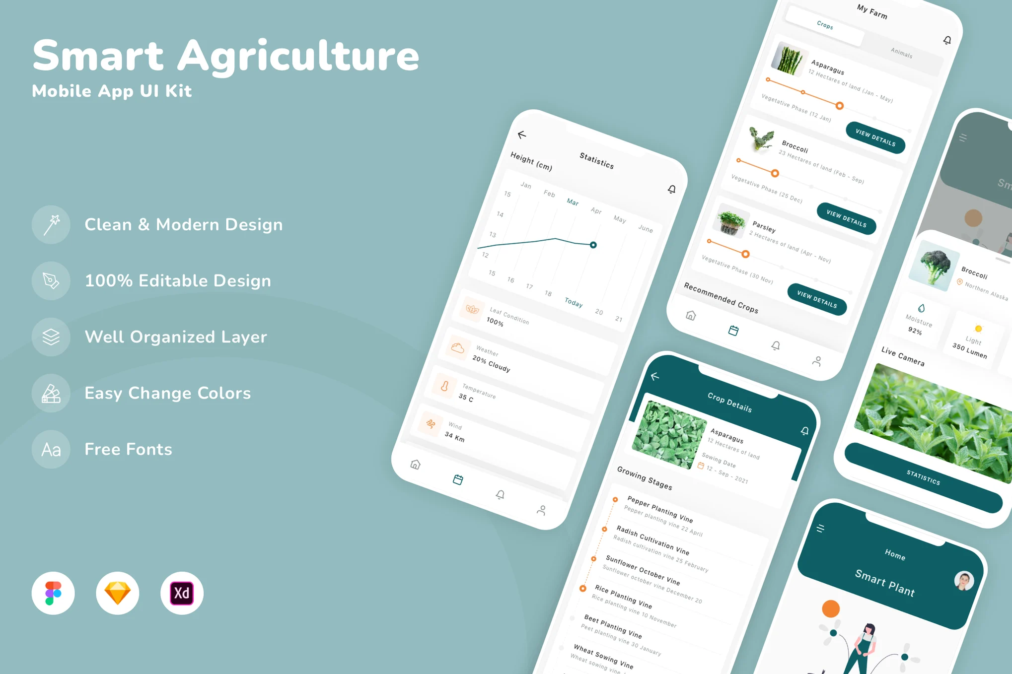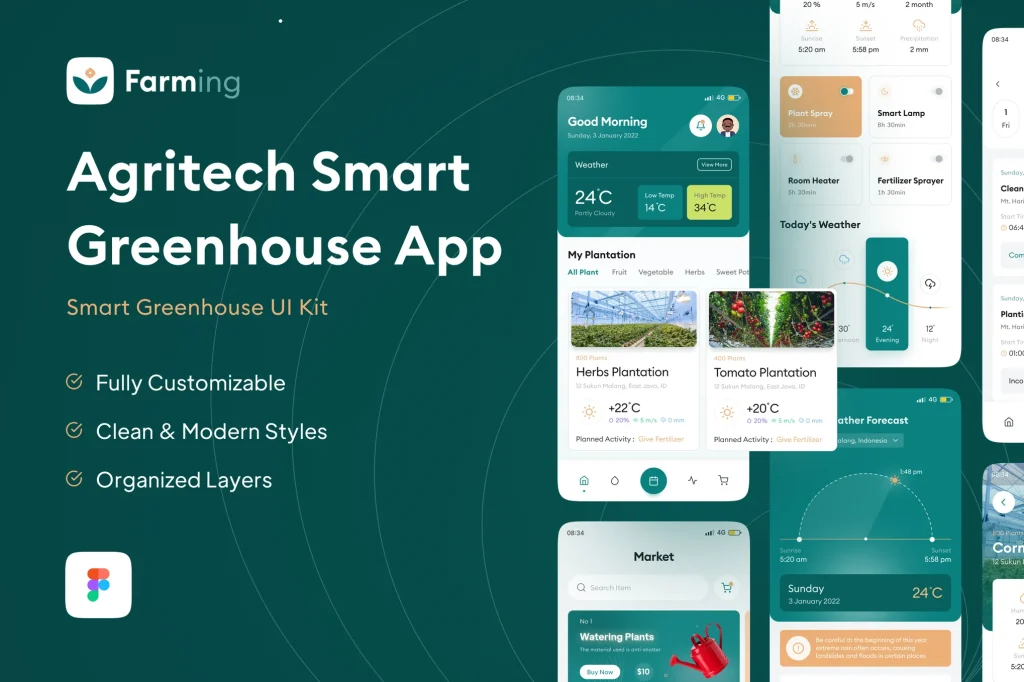 Building every screen and element manually can be time-consuming. Using a UI Kit allows you to skip repetitive design work and concentrate on improving usability, performance, and innovation. Most agriculture UI kits come with fully customizable layers, making it easy to adapt the designs to your brand.