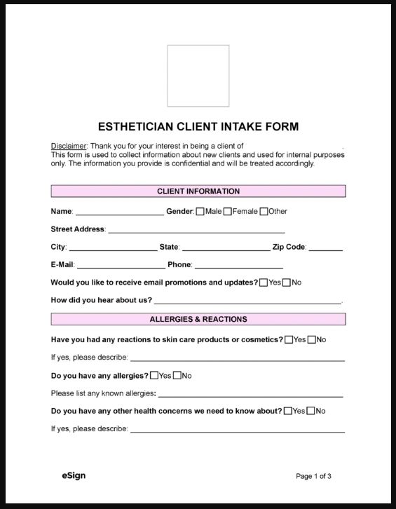 • Esthetician Intake Form – Collects information such as contact details, allergies, current medications, and skincare routines.