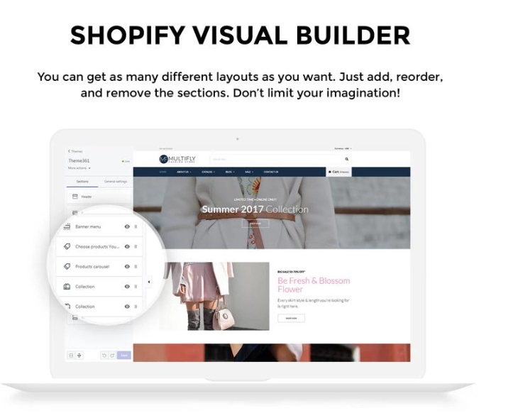 Basically, the design of Multifly is simple, colorful, and attractive. It’s also versatile, which means you can change any detail. For these simple reasons, I’d say that Multifly allows a user to run any kind of online shop. Yep, you can just pick a set of pages to get your web shop just out of the box. On the other hand, there are a lot of users who prefer to work with the unique pages. And you can do it as well! How? That’s what the brand-new Shopify Visual Builder was added for.