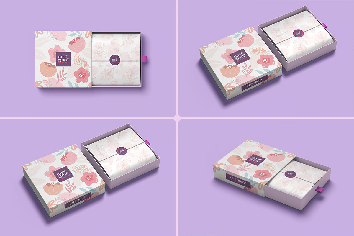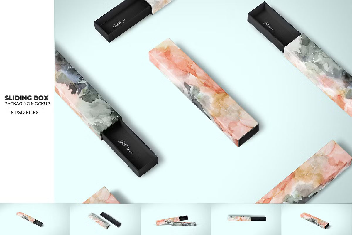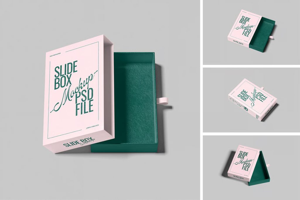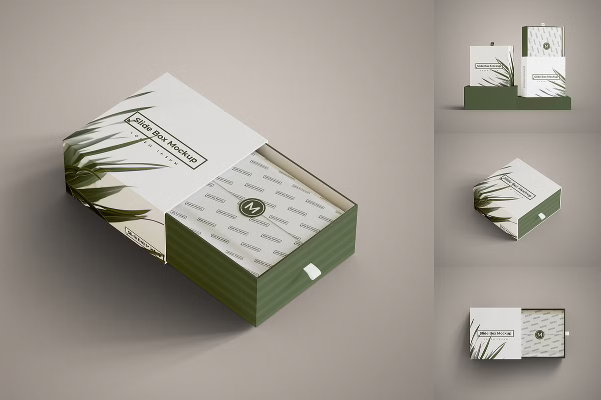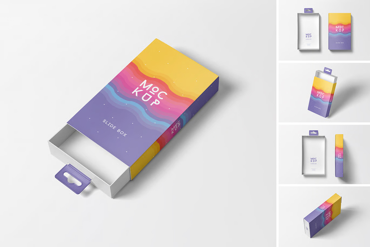 Modern slide box mockups are designed with flexibility in mind. Most of them come in high-resolution PSD formats, which means you can edit them using simple drag-and-drop smart objects. This ensures your packaging design looks clean and photorealistic from every angle.
